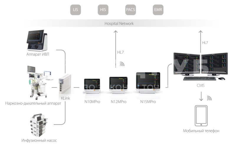 Мониторы NMPro предоставляют эффективное решение для непрерывной связи с системами централизованного наблюдения, благодаря чему усовершенствуется рабочий процесс в медицинских учреждениях и расширяются функции по уходу за пациентами. Эти устройства отличаются высоким уровнем интеграции, предоставляя возможность мгновенной передачи медицинских данных, графиков и сигналов оповещения с использованием широко применяемого протокола HL7. Интеграционный модуль KLink обеспечивает бесперебойное соединение с различным медицинским оборудованием, таким как анестезиологическое и аппараты ИВЛ, а также с инфузионными насосами. Все данные отображаются в режиме онлайн на экранах NMPro, что способствует повышению эффективности клинических процедур и оптимизации обработки информации о состоянии пациентов.