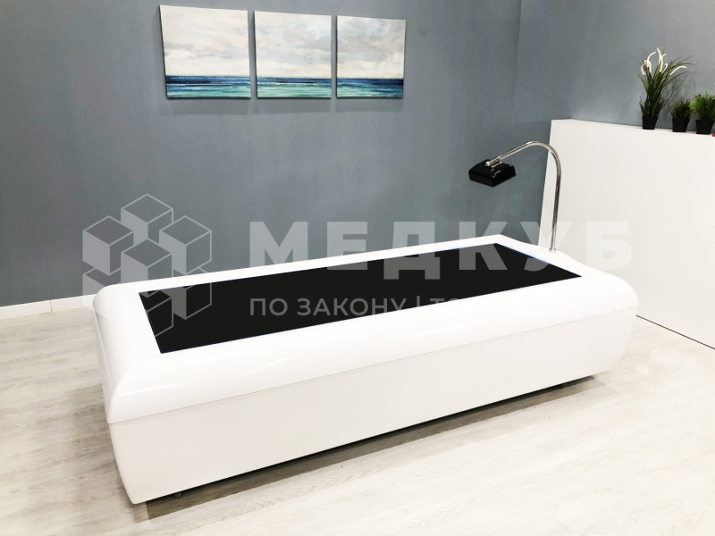 - со светопрозрачным ложе с функцией хромотерапии, обеспечивающее возможность выбора цветовой подсветки из предустановленных программ или же фиксацию на выбранном цвете. Хромотерапия способствует балансировке состояния нервной системы пациентов. Клинические исследования подтвердили, что хромотерапия усиливает эффект от гидромассажа, если их применять в комбинации. Помимо этого, в данном варианте комплектации подсветка устроена и в нижней части кушетки, создавая дополнительное освещение для пола. Управлять системой хромотерапии можно благодаря сенсорной кнопке, удобно размещённой возле главного управляющего устройства.