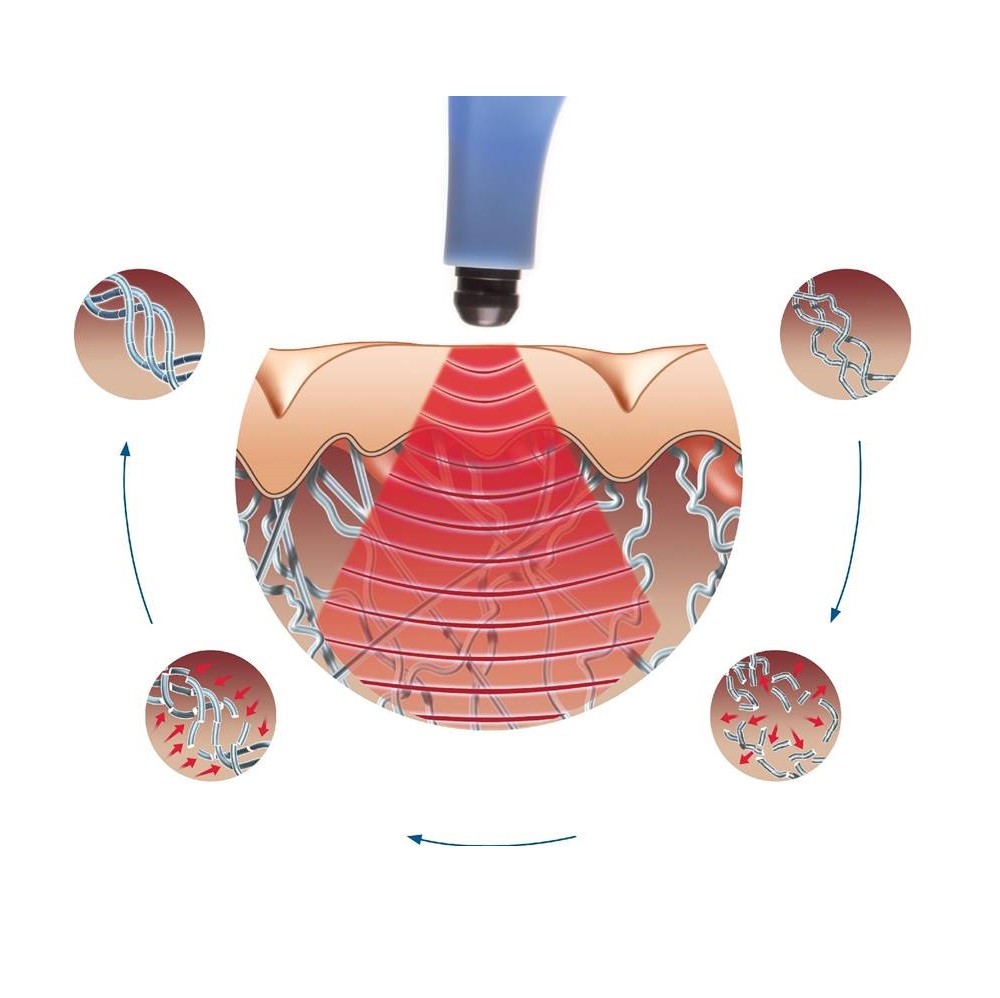 На поверхности кожи и в дерме температура достигает 41-42˚С. Происходит фрагментация «старого» коллагена, стимуляция выработки нового и как следствие - подтяжка кожи.