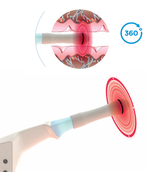 Благодаря специально разработанному аппликатору с воздействием в 360˚ значительно улучшена терапия труднодоступных зон.