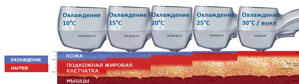 Энергия проникает в жировую ткань, нагревая ее до 44-46˚C, что усиливает обмен веществ, улучшает микроциркуляцию, активизирует процессы расщепления жиров и вызывает уменьшение размеров адипоцитов.