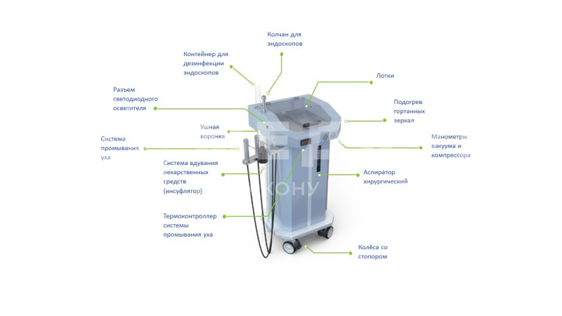 В стандартную комплектацию входят система промывания уха и аспиратор жидкости. Эта система обладает рядом преимуществ, включая возможность быстрого нагревания инструментов для осмотра горла. Для удобства работы с распылителями и аспирационными устройствами предусмотрены специальные держатели. Установка интегрирована в стационарную водопроводную сеть, что облегчает подачу воды. Также имеется возможность точной настройки давления воздуха в пределах от 0 до 2,5 бар благодаря встроенной системе регулировки. Качество воды обеспечивается за счёт системы фильтрации. Корпус устройства изготовлен из металла с антибактериальным покрытием для обеспечения гигиены. Верхняя панель снабжена прозрачной крышкой и предназначена для хранения медицинских инструментов в лотках.
