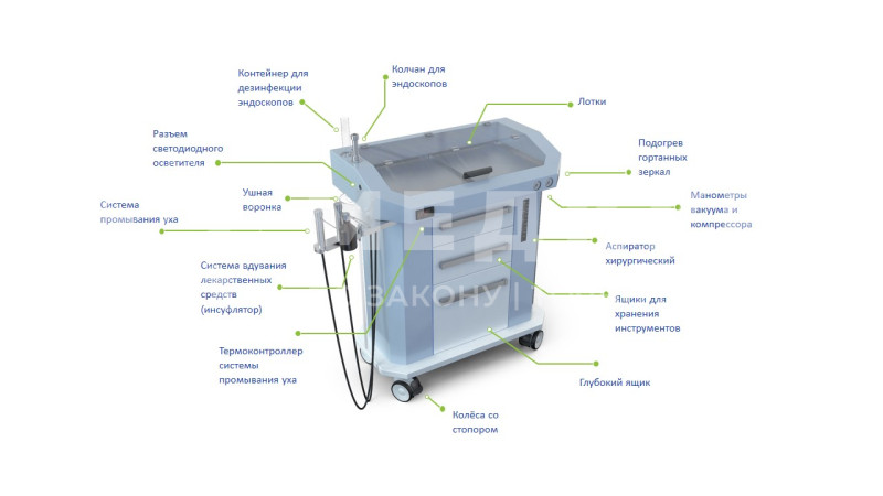 В стандартную комплектацию входят система промывания уха и аспиратор жидкости. Эта система обладает рядом преимуществ, включая возможность быстрого нагревания инструментов для осмотра горла. Для удобства работы с распылителями и аспирационными устройствами предусмотрены специальные держатели. Установка интегрирована в стационарную водопроводную сеть, что облегчает подачу воды. Также имеется возможность точной настройки давления воздуха в пределах от 0 до 2,5 бар благодаря встроенной системе регулировки. Качество воды обеспечивается за счёт системы фильтрации. Корпус устройства изготовлен из металла с антибактериальным покрытием для обеспечения гигиены. Верхняя панель снабжена прозрачной крышкой и предназначена для хранения медицинских инструментов в лотках.