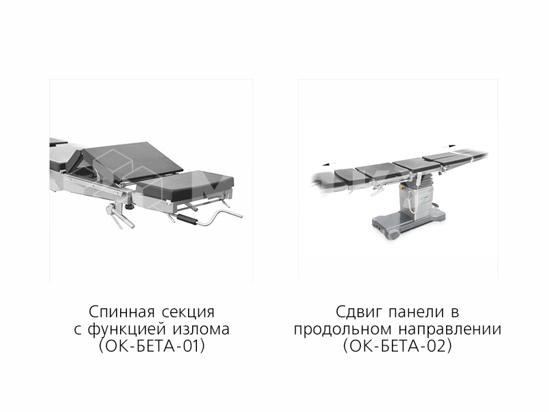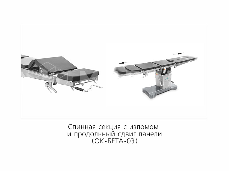 Использование дополнительных опций, таких как излом спинной секции, продольный сдвиг панели, механический почечный валик, дает возможность изменять конфигурацию панели стола ОК-БЕТА в соответствии с пожеланиями заказчика и тем самым расширить его функциональные возможности.
